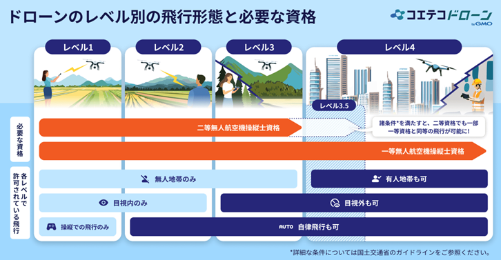 無人地帯での補助者なし目視外飛行(レベル3)や、特定の条件下での飛行を安全に行うための資格です。